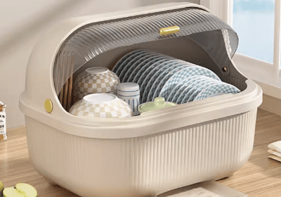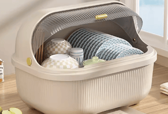 A sleek white dish storage box with a transparent lid, neatly holding bowls, cups, and a vase. Made of durable plastic, it features a gold handle for portability. Perfect for organized kitchen storage.