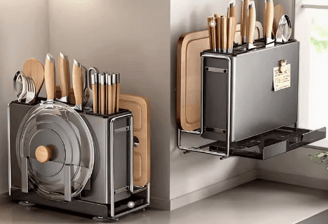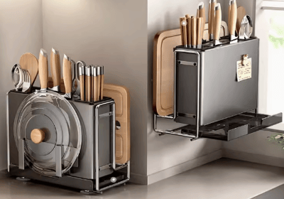 This modern kitchen knife organizer boasts a sleek design, featuring two wall-mounted racks for organized storage of knives and forks. Brown handles with silver blades add a stylish touch to the practical storage solution.