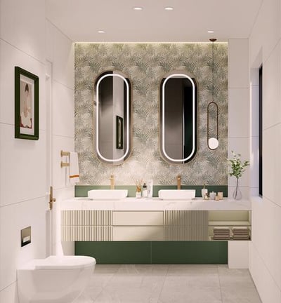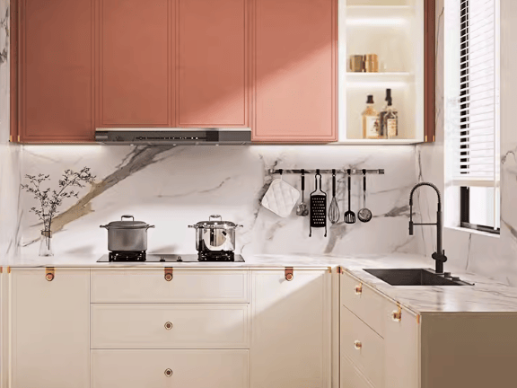 The modern kitchen cabinet boasts dual doors for ample storage, keeping kitchen essentials neatly tucked away, enhancing both functionality and organization within the space.